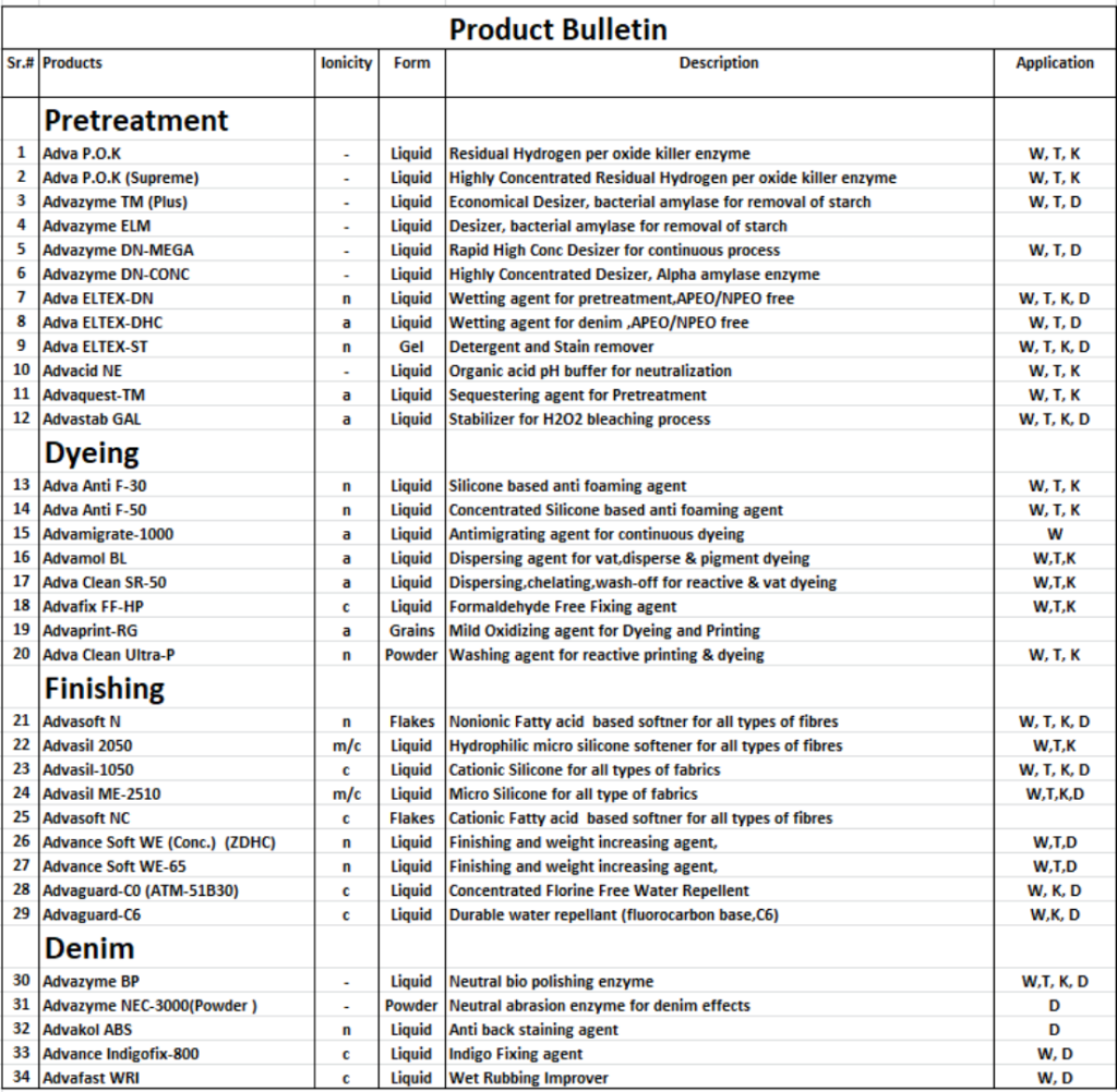 | 3 | Advazyme TM (Plus) | – | Liquid | Economical Desizer, bacterial amylase for removal of starch | W, T, D |